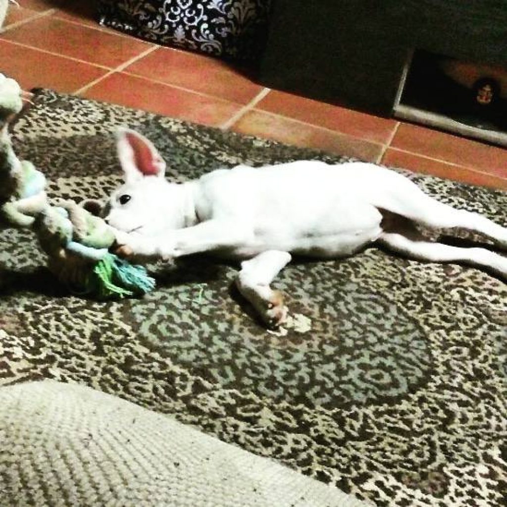 Molly’s perfect day would begin with lots outside play with her foster brothers and sisters, followed by a big bowl of water that she can drink and splash in (she’s a little messy – we think she might be part hippo). After lots of running and wrestling, she would love a long walk around the neighborhood to meet all the dogs and sniff all the plants. A light lunch followed by some behavior training (she loves boiled chicken, and this is when she gets it) then would kick off an afternoon in the playroom with her pack, chewing on Kongs and sleeping in her beanbag. She loves a cuddle bed! After a short nap, she would want to play a game of tug with her human foster sisters, and then probably go back outside to wrestle with her pack again. The only thing she asks is that you don’t give her a bat h- she worked hard for that tired puppy perfume smell and would like to wear it to bed! 😉