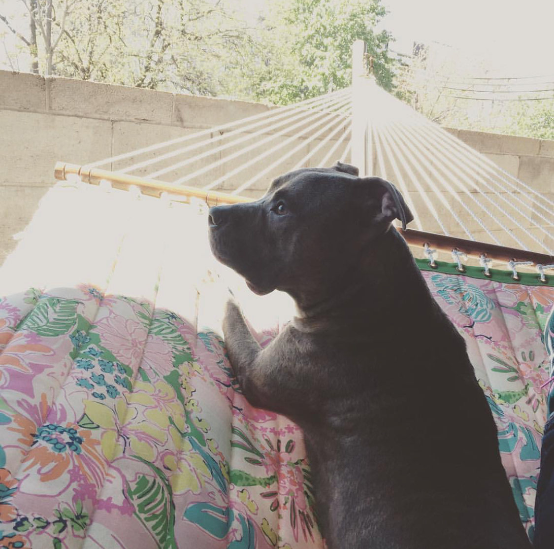 Morning zoomies, standard breakfast with maybe leftover sausage if foster mom goes to Homegrown, walk on the Atlanta Beltline learning leash manners, snuggles on the couch, play time with foster sister Zoey, dinner, and more couch snuggles