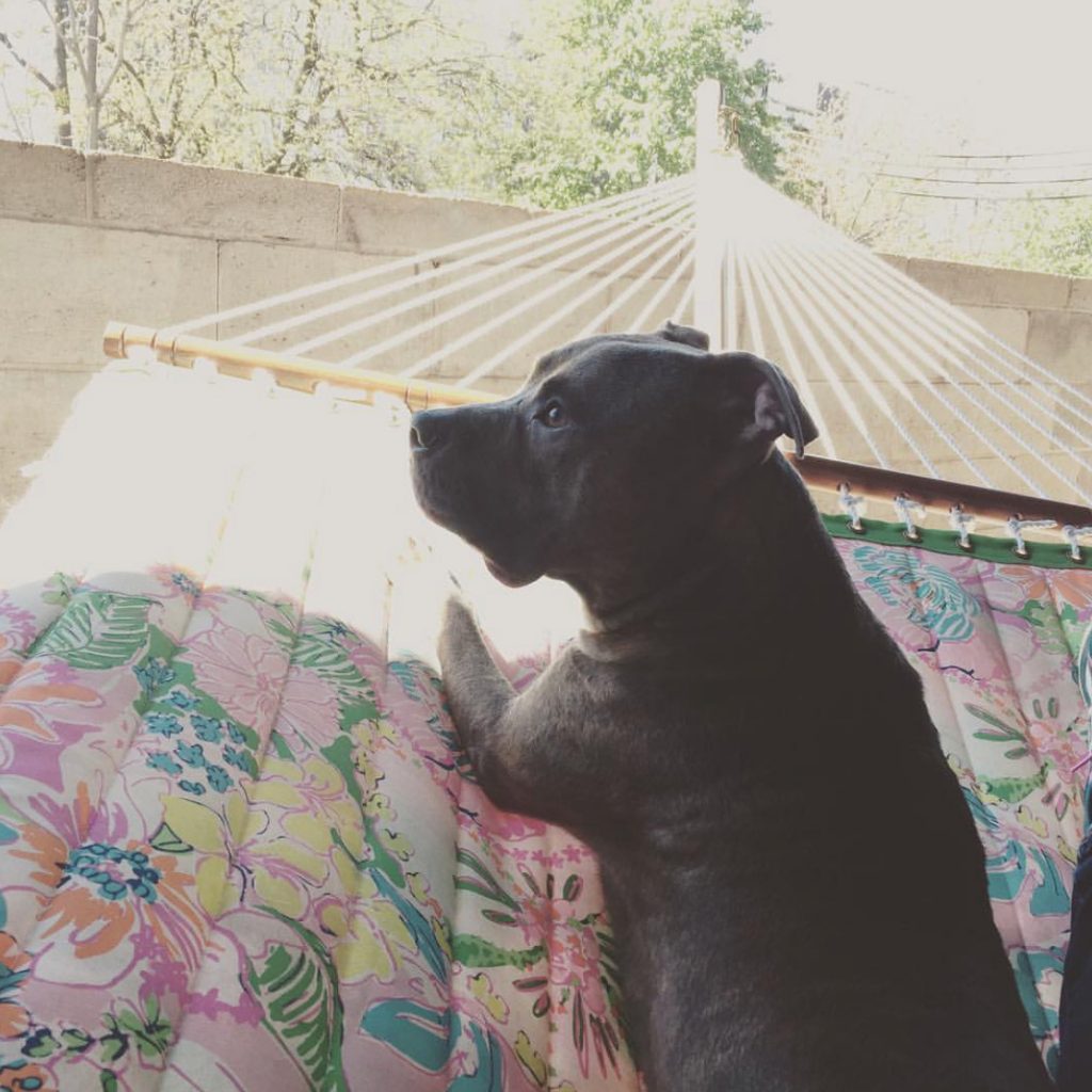 Morning zoomies, standard breakfast with maybe leftover sausage if foster mom goes to Homegrown, walk on the Atlanta Beltline learning leash manners, snuggles on the couch, play time with foster sister Zoey, dinner, and more couch snuggles