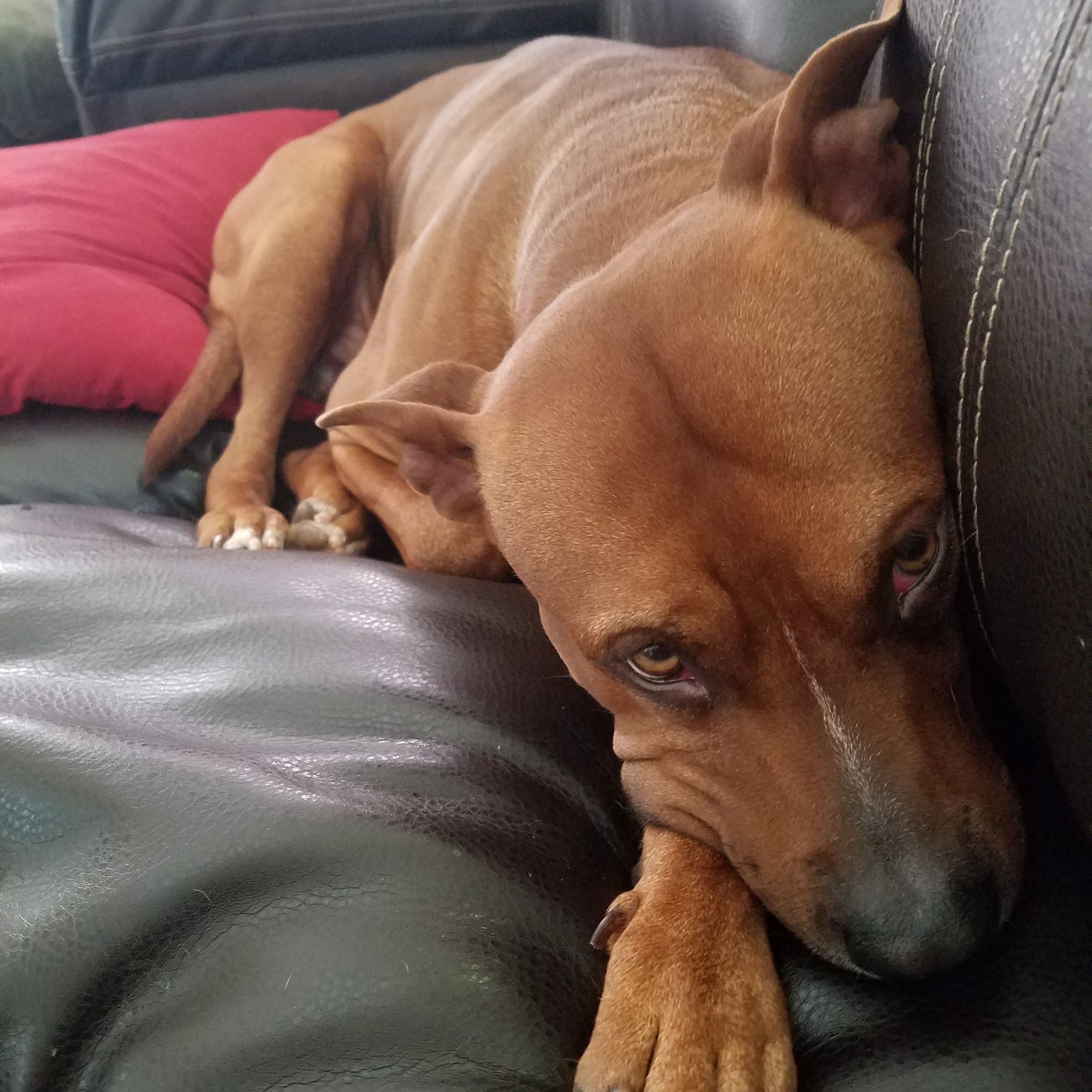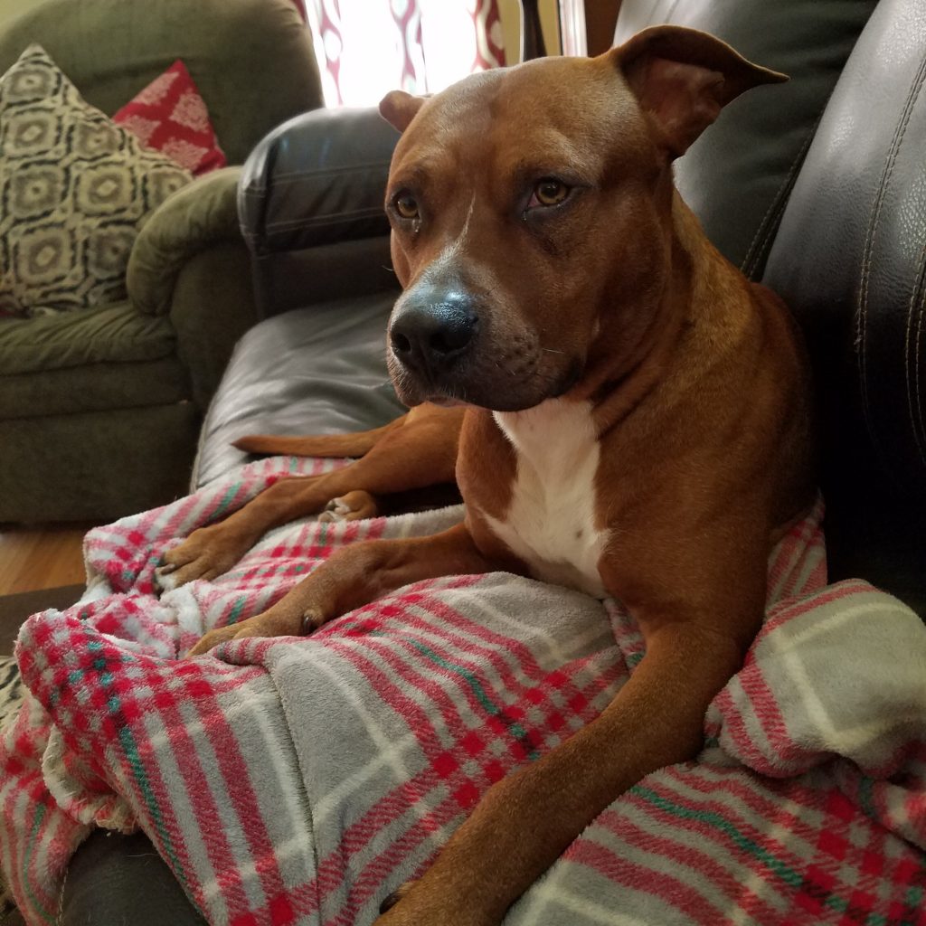 Calvin found himself in Henry County Animal Services which does not adopt out bully breeds. The shelter workers described him as a calm and collected guy in his run as he kept it clean and was quiet. He also showed off his sit, shake and lay skills to them. I stepped up as he obviously was abandoned by his previous humans when they were evicted and he needed new humans to save his life.