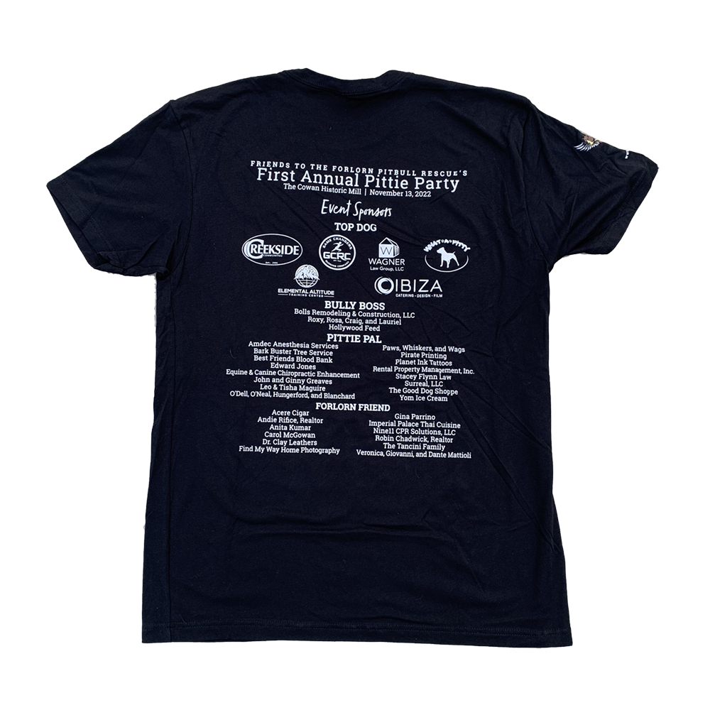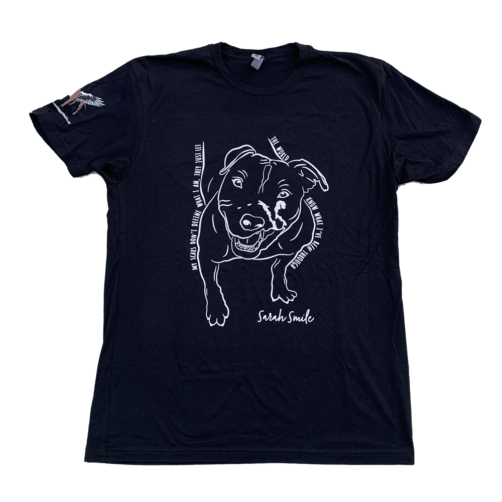 Our inaugural Pittie Party event tee is made of extra-soft fabric and features custom “Sarah Smile” design and quote from Jason Flatt.